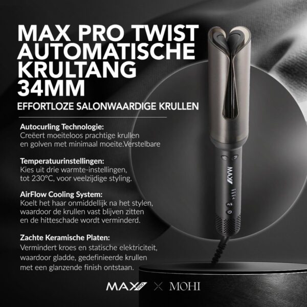 De Max Pro Twist Autocurler 34 mm maakt krullen stylen makkelijker dan ooit. Met één druk op de knop draait het apparaat je haar automatisch rond de 34 mm barrel, waardoor je in een handomdraai prachtige krullen of golven creëert.